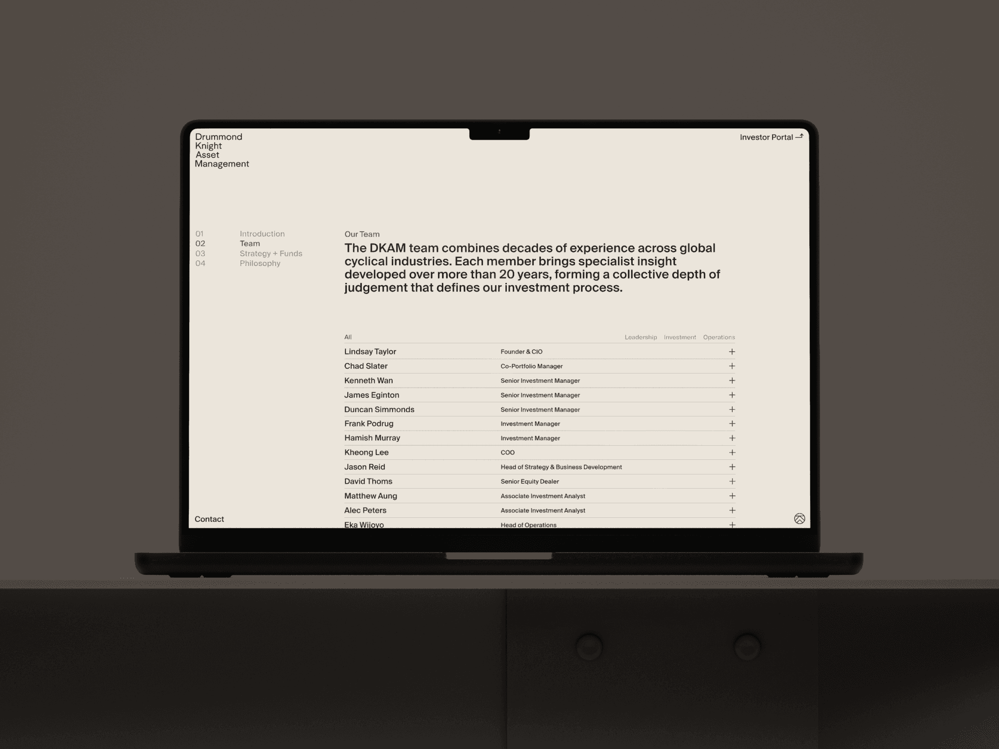 A global alternative investment manager focused on equity investments across cyclical sectors, Drummond Knight Asset Management (DKAM) engaged Nectar to refine their brand identity and develop a new digital platform to increase visibility of their strategy and funds. By simplifying and sharpening their narrative, we established a restrained, modern visual language and designed a minimal website that communicates clarity, discipline and conviction. Built within the Webflow environment, the platform now serves as scalable digital infrastructure, strengthening investor engagement through a private portal, enhancing credibility and supporting the communication of DKAM’s global investment activity.